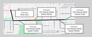 Unraveled obtained GPS logs for the police vehicle Solano was driving on February 8, 2025 through a Freedom of Information Act (FOIA) request. The logs show Solano quickly accelerated westbound on Irving Park Road, reaching a speed of 76 mph just before turning on Oak Park Avenue.
