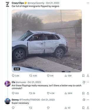 Under another video clip purporting to show a “car full of illegal immigrants” crashed into intentionally, someone asks if the car flippings are really necessary. “Super necessary,” Donahue replies. Federal agents were involved in numerous car crashes, including at least one admitted PIT maneuver on the Southeast Side, across Chicagoland throughout September and October.