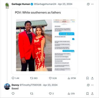 He shares several racist memes, including one that calls the Juneteenth holiday “retarded and gay,” and also approves (“Based”) of a (potentially fictional) writeup of a “Southern” father disowning his daughter for going to prom with a Black man, complete with a barrage of racial slurs.