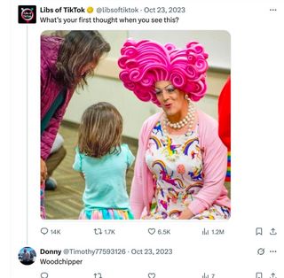 Donahue makes a number of bigoted comments about queer and trans people. In the replies to a post from right-wing hate account Libs of TikTok, he simply remarks “Woodchipper” to a photo of a drag queen.