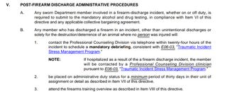 Department policy requires a minimum 30-day period of administrative duties after an officer discharges their firearm, but the policy exempts shootings “solely for the destruction/deterrence of an animal.” Also, no policy mandates officers take time away from their interactions with the public if they are merely present when another officer discharges their firearm.